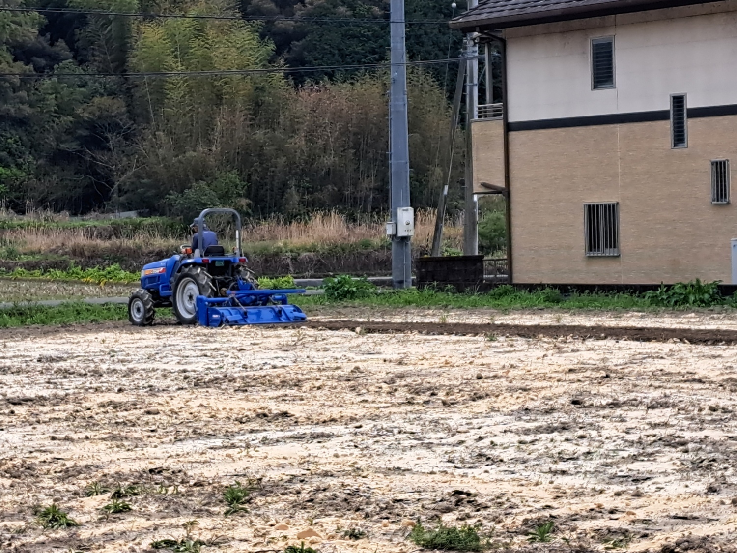 今日は畑に米ぬかをまき、トラクターで耕運しました。米ぬかをまくとイノシシが寄ってきやすくなるので、すぐに耕運して土に混ぜます。サツマイモの定植は5月上旬を予定しています。定植の約1ヶ月前をめどに米ぬかを入れます。お天気も安定しないので今日のうちに・・・と早朝から作業をしました(メンバーさんは後から)。